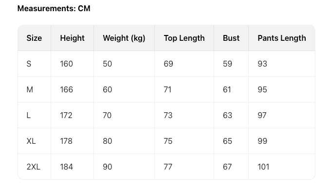 Size HEIGHT(CM) TOP LENGTH(CM) CHEST 1/2(CM) WAIST(CM) SLEEVE(CM) PANTS LENGTH(CM) Version
